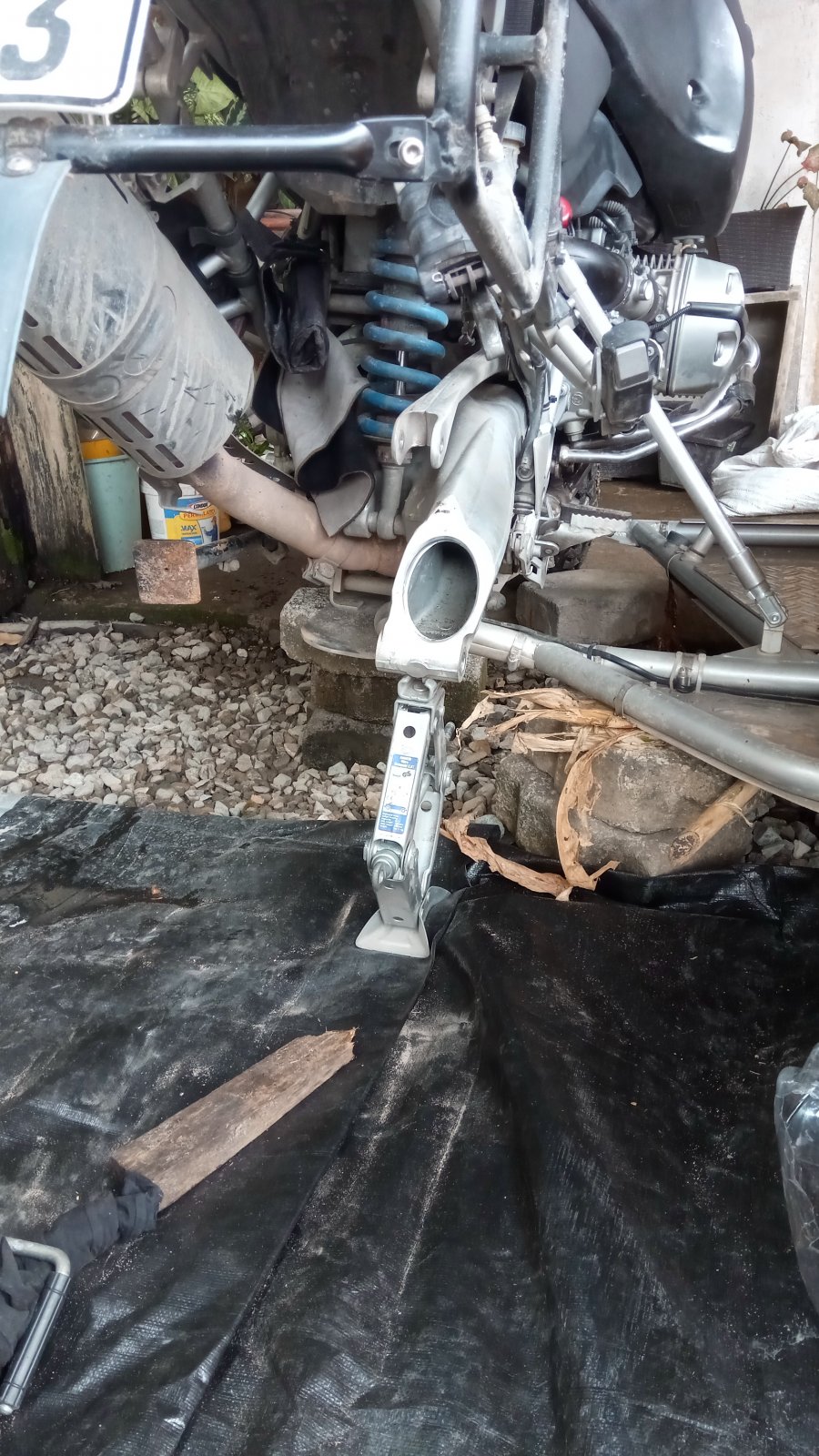 Today we stripped the wheel and diff (Hinterachsgetriebe) off the bike, to find the diff was completely dry, no oil in it at all. It transpires that the garage that repaired the gearbox back in Cabo San Lucas in Mexico had said to Toshi, oh we spilled a bit of oil from the diff, but only a drop, it will be fine, yet now the diff is empty except for a mass of ground down metal, yet we kept checking there were no leaks, so it must have been a very big drop they spilled. So now to find another diff and somehow get it shipped here.”