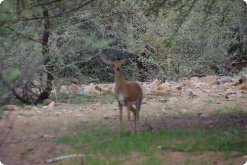 Sogleich befragten wir ihn und er erzählte uns, das die 100 Quadrakilometer große Farm seinen Eltern gehöre. Es gebe reichlich Kleinst-, Mittel- und Großantilopen, Zebras, Giraffen und Leoparden hier. Im Übrigen wären wir hier in der Gegend mit der größten Leopardenpopulation in Namibia. Sie hätten vor Jahren von Rinder- auf Wildhaltung umgestellt. Es hatte sich herausgestellt, das Wildhaltung effizienter und nachhaltiger sei. Die Natur leide nicht so unter der Wildhaltung.