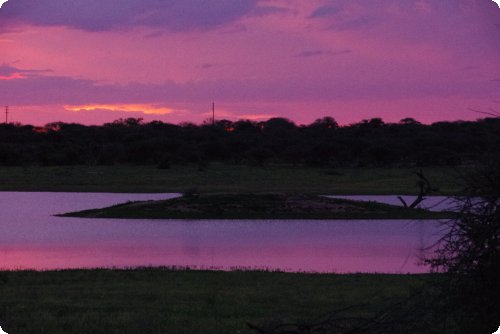 Nach dem Abendessen (Sabine ist eine wirklich tolle Köchin und Uwe ein Meistergriller. Das muss mal gesagt werden!), wohnten wir einem spektakulärem Sonnenuntergang am See bei. Die Nilpferde zeigten sich in der Dämmerung und das Krokodil war nur durch seine Wellenbewegung im hinteren Drittel des Sees auszumachen. Als es dunkel war, kamen die Nilpferde zum Grasen aus dem Wasser. Sie laufen bis zu 35 km in einer Nacht, und kommen beim Morgengrauen in den See zurück. Dort kuhlen sie sich ein bis sie in der Dämmerung wieder aktiv werden, erzählt uns Heiko. Übrigens können sie eine Laufgeschwindigkeit von 45 km/h aufbringen. Auch in den nächsten zwei Tagen ließen wir uns das Naturschauspiel nicht entgehen. Am Lagerfeuer sitzend, lauschten wir in die Nacht hinein oder erzählten uns gegenseitig, was unsere jeweilige Motivation zu reisen ist.