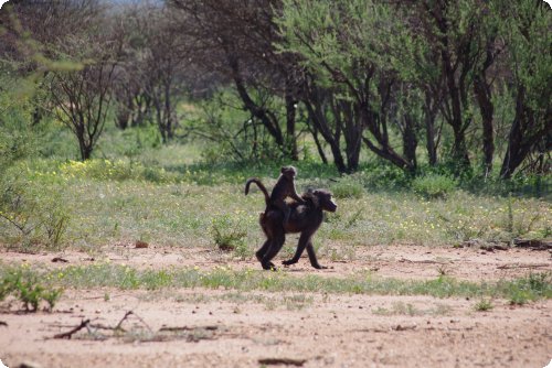 Wir sahen eine Tüpfelhyäne im Schatten liegen, Paviane herumhängen, Giraffen, Zebras, allerlei Wild und Perlhühner. Lampionbäume, wie ich sie nenne, da die Vogelnester wie Lampions herunterhängen. Und das Ganze für umme, denn durch den privaten Park gehen zwei offizielle Dirtroads. Wenn Engel reisen!