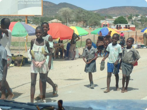 Unser Weg führte uns von Ruacana nach Osthkati. Immer an der angolanischen Grenze entlang. Hier oben lebt der größte Anteil der schwarzen Bevölkerung Namibias. Überall an den Strassen sind eingezäunte Siedlungen mit zum Teil nur runden Lehm-und Strohhäusern, Steinhäusern und auch Blechhütten zu entdecken. Es scheinen dort Familien zusammen zu leben. Kinder laufen am Strassenrand in Grüppchen von der Schule nach Hause. Ihr Heimweg scheint zum Teil ein langer Weg zu sein. Manche lachen, rennen um die Wette, erzählen oder sammeln etwas am Strassenrand, was wir nicht identifizierem können. Die Dörfer und die Städte wirken wie “normale” Dörfer und Städte. Wir befinden uns eben nicht in den touristischen Zentren. Hier gefällt es uns. Das ist Afrika für uns!