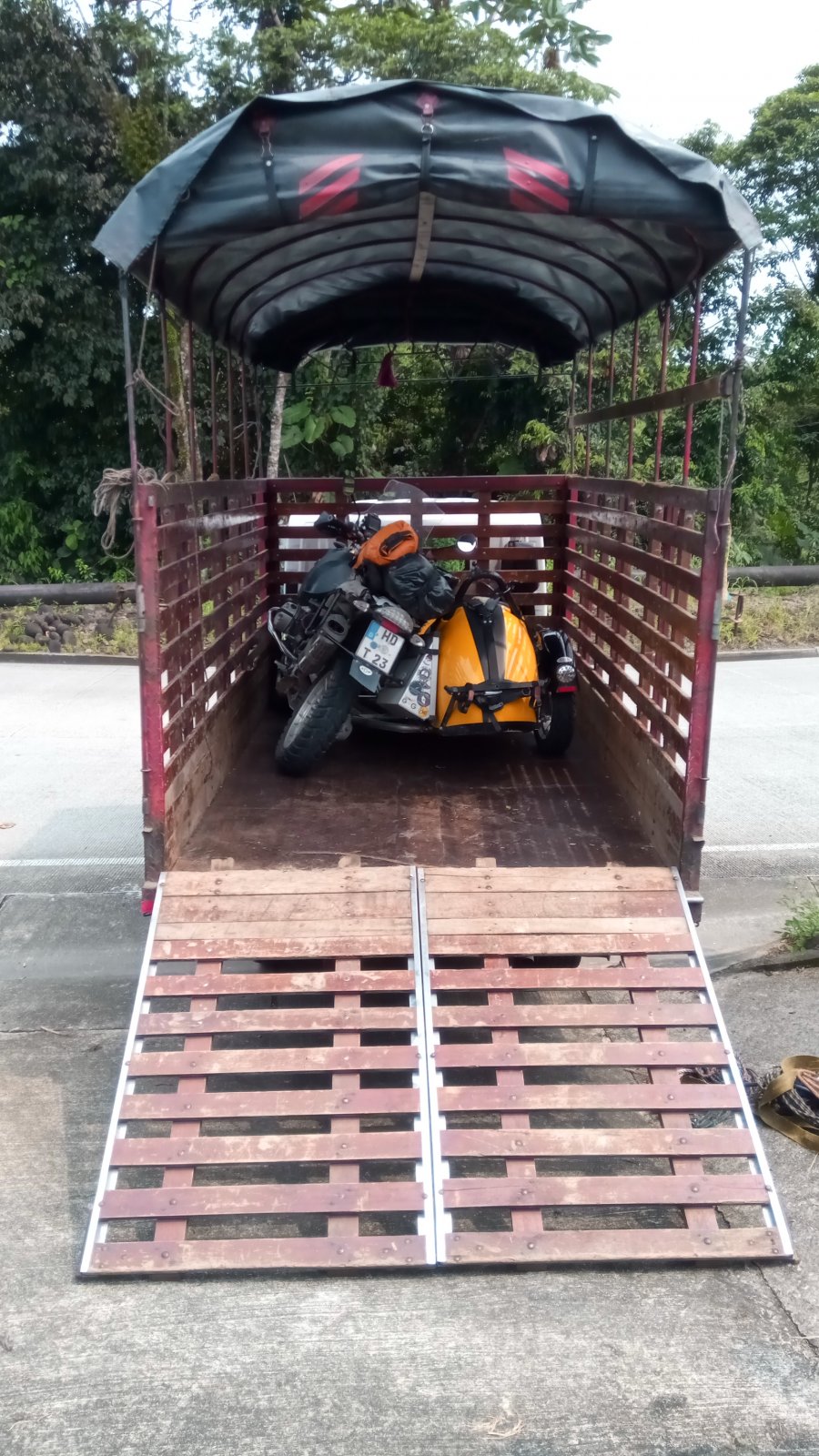We stopped outside what we thought was a derelict house, and were deciding what to do when the resident of the apparently not so derelict house turned up on a little motorbike, after a fair discussion between him and Toshi, who’s spanish is thankfully much better than mine, the man set off to get some friends with a cattle truck. Quite a while later the truck appeared but was obviously much too small, so the driver phoned a friend (i guess he’d already used his 50/50 and had asked the audience) and the friend duly appeared with a much bigger truck, with the help of 4 locals and a very steep driveway we managed to get the outfit onto the truck, and away we trundled to the border with H&T in the cab and me following behind.