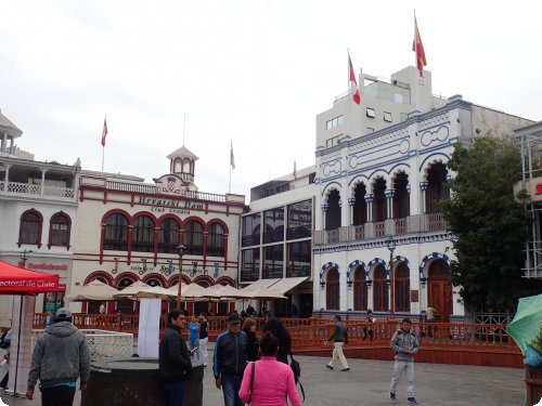 Die letzten drei Nächte haben wir in Iquique verbracht. Eine ganz angenehme Stadt, die, anders als viele andere Hafenstädte hier, keinen ungemütlichen oder gar heruntergekommenen Eindruck macht. Nein, hier gibt es (neben den überall dazwischen gebauten Wellblech- und Sperrholzbauten) einige an Westernfilme erinnernde historische Holzbauten. Sie sind ein- bis zweistöckig, und stehen in hübschem Kontrast zu den wenigen steinernen Bauten im Kolonialstil. Das Spanische Kasino und der Kroatische Club sind an der Plaza wirklich prominente Beispiele, neben dem Städtischen Theater und dem Uhrturm, der allerdings nur so aussieht, als wäre er aus Stein. Bei näherem Hinsehen erkennt man, dass das gesamte Gebäude ebenfalls ein Holzbau ist. Mit viel Gips und Verputz auf “Stein” gemacht.
