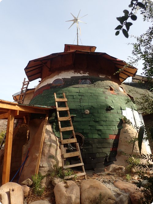 Sein Zuhause ist ein selbstgebautes rundes Lehmhaus. Solar und Windkraft versorgen ihn mit Strom. Ein Ofen aus Spanien gibt ihm Wärme mit Holz, heißes Wasser zum Abwaschen und gleichzeitig gekochtes Essen. Ein mit Benzin betriebender Generator versorgt die Geräte, die er zum Schrauben oder Schweißen braucht. Mich erinnert es hier an eine Mischung aus Waterworld, Geschichten von Jules Verne und an die Häuser der Hobbits.