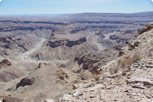 Entlang des Orange Rivers, der sich durch eine grüne Zone inmitten von trockenem Ocker an Berg auszeichnet, ist ein Fahrvergnügen. Die Strasse windet sich wie eine Schlange. Tagesziel war der Fish River Canyon im AisAis NP (Nationalpark), der der zweittiefste Canyon der Welt sein soll. Die Strasse dahin eine Katastrophe. Waschbrett, Steine, Waschbrett, Steine. Nie im Lebtag hätte ich es im Beiwagen ausgehalten. Ich hätte neben körperlichen Schmerzen, ständig etwas brechen, platzen oder abfallen gesehen. Schon im Auto ereilten mich wieder diese alten Ängste. Kupplung, Getriebe und Endantrieb spielten ihr Unwesen in meinem Kopf.