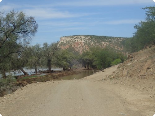 Wir erhielten von zwei Seiten die Information, das die Flußdurchfahrten auf unserer Route Epupa/Ruacana machbar seien. Diese Route würden wir mit zu den schönsten Routen durch Namibia bezeichnen. Guter Gravel, kaum Verkehr, hügelig, mal ziemlich steil verlief sie am Kunene River entlang. Für die Dicke und den Beiwagen wäre das nichts gewesen, aber für Solomotorräder sicher gut machbar. Für die große Flussfahrt mussten wir einen Umweg fahren, die der Besitzer des Cornie Camp in drei Tagen frei gewalzt hatte. Dort war lediglich tiefer Sand. Die anderen Beiden waren leicht zu nehmen. Das Flussufer muss wohl sehr fruchtbar sein, denn hier wird Ackerbau betrieben. Mais und Hirse vorallem. Traumhafte Ausblicke auf den Fluss und auf die Berge in der Ferne.